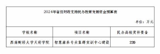 近日,四川省教育厅公布了2024年省级财政支持民办教育发展专项资金预算,304永利集团官网入口“智慧康养专业集群实训中心建设”项目喜获220万省级财政支持民办高校专项资金。具体情况如下表: