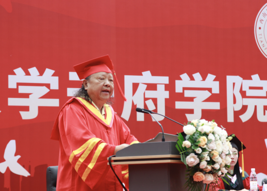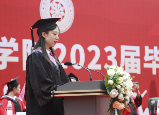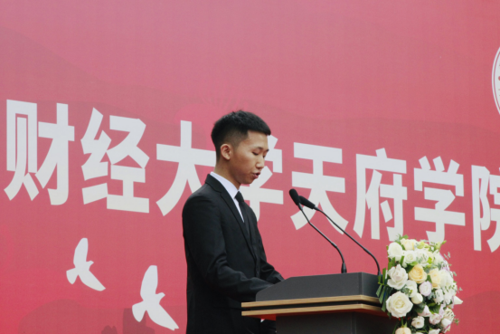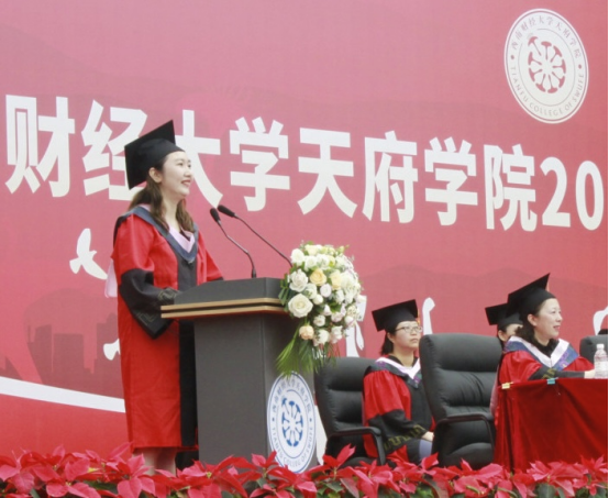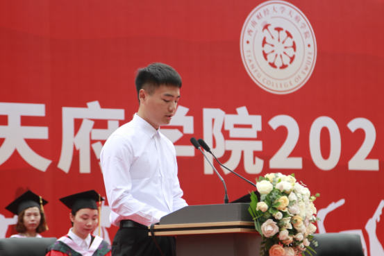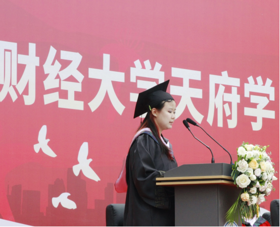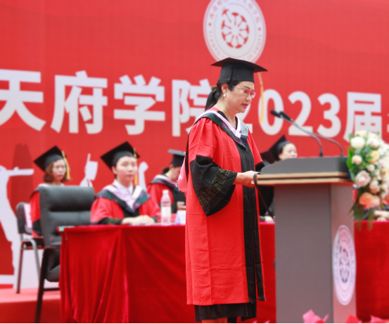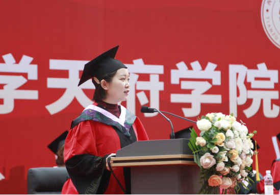 教师代表王雪、黄琴进行发言,代表天府学院全体教师向圆满完成学业的同学们致以诚挚的祝愿,希望同学们在充满挑战的人生新阶段,始终保持谦逊、善良与关爱他人的美好品质,与真实、勇敢、坚持与责任为伴,度过期待成功的日子,祝愿同学们未来一路平安,桥都坚固,隧道都光明。
