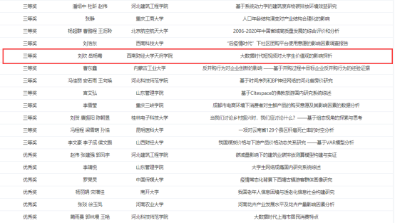 近日,由中国知网联合清华大学技术创新研究中心、中国农业大学经济管理学院、北京交通大学经济管理学院、厦门大学数据挖掘研究中心等单位主办的第一届数据研究与应用大赛落下帷幕,评选出一等奖2名,二等奖8名,三等奖15名,优秀奖8名。我校师生积极参赛,认真备赛,提交多项作品,学校获得优秀组织单位奖。同时,现代服务管理学院刘欢老师和现代服务管理学院智慧管理俱乐部学生岳杨骞合作的作品《大数据时代短视频对大学生价值观的影响探析》获得三等奖。