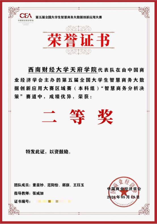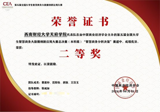 同时,由现代管理学院教师易梦洁、郑婧的指导下,来自大数据管理与应用专业的张欣竹、吴诗语、王雨欣、李佳兴、张鹏、杨文恺、王硕七位同学,在“商业大数据创新应用”赛道也展现出了优秀的团队协作和专业素质能力并斩获区域赛一、三等奖和全国总决赛二、三等奖。
