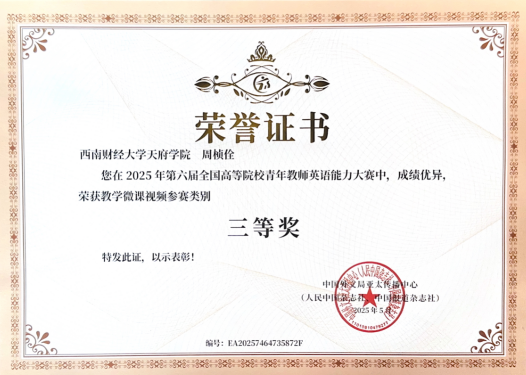 为深入贯彻教育部《国家教育事业发展“十三五”规划》、落实高等院校英语教学改革精神,顺应“一带一路”发展的新形势,2025年第六届全国高等院校青年教师英语能力大赛顺利举办。比赛由中国外文局亚太传播中心面向全国高校青年教师举办,受到各高校及相关单位的广泛好评。304永利集团官网入口工程与材料学院教师周桢佺以全英文教学课程作品“Cost Planning, Control and Management”参与本次大赛,并最终取得全国三等奖的成绩。