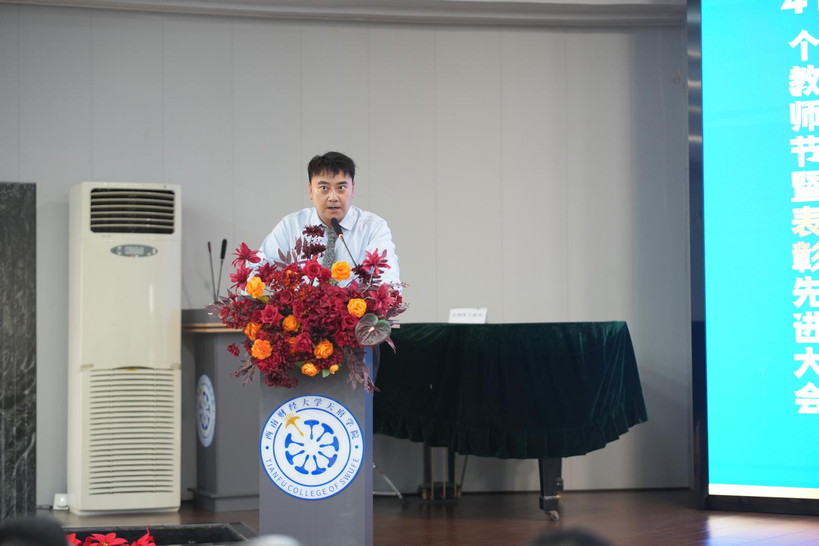 艺术与传媒学院教师施倩、智能科技学院教师郭进、现代管理学院教师牟文浩、康养护理学院分党委书记陈永清作为获奖代表分别上台发言。他们回顾了在各自岗位的心路历程,分享了奋斗路上的经验做法和工作感悟,对学校领导与同事长期以来的支持表示衷心感谢。他们表示,这份荣耀不仅是鼓励和鞭策、更是崭新的起点,未来必将以此为动力,继续坚守初心,用爱陪伴、用心育人,将知识与希望的种子在为党育人、为国育才的道路上播撒得更远;继续发扬拼搏精神,凝聚奋进力量,以更饱满的热情在人工智能时代背景下书写更加辉煌的篇章。