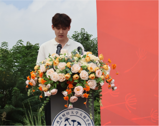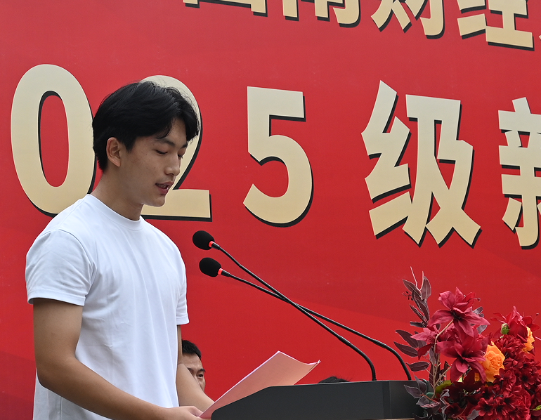 国际教育学院李林娟、艺术与传媒学院唐黎媛、会计学院唐波力·拉扎提和体育学院杨丁爽作为2025级新生代表,在发言中分享了他们对即将开启的大学生活的展望与憧憬,表示期待着在这段青春旅程中实现成长、探索与蜕变,在校园里广泛汲取知识、不断拓宽认知边界,结识志同道合的伙伴,并通过持续探索,最终找到属于自己的方向与人生价值。