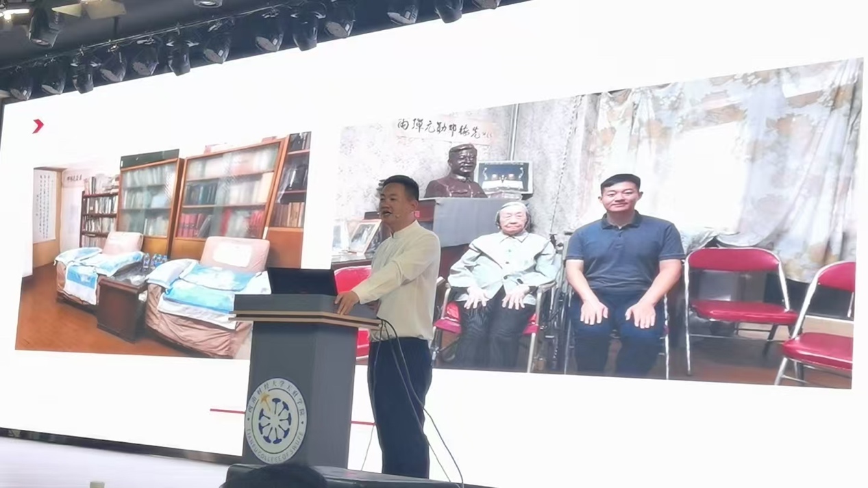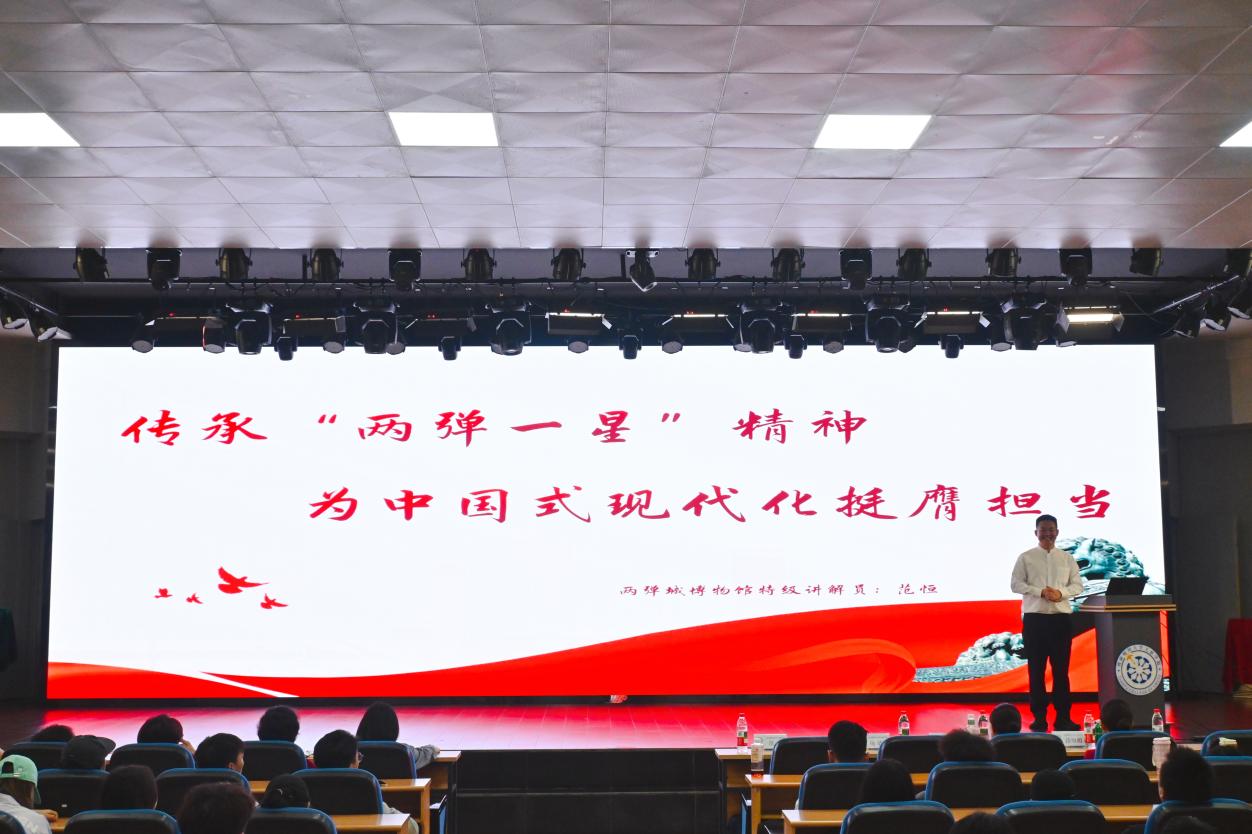 接着,两弹城博物馆特级讲解员范恒作《传承“两弹一星”精神 为中国式现代化挺膺担当》主题宣讲。他以今年九三阅兵首次集中展示中国“三位一体”战略核力量为切入点,引出了“两弹一星”研制的历史背景,并结合丰富的历史资料和鲜活的感人故事,解读了“两弹一星”元勋邓稼先成长路上的三次思想跃迁,回顾了那群青年学生当年在荒漠书写科研传奇的艰苦岁月。范恒的讲解,形式多样,情感饱满,引人入胜。讲解过程中,他用四川金钱板表演艺术形式演绎“原子弹是算出来的”的奇迹;他带领师生诵读西南联大校歌《满江红》与王昌龄的诗《从军行》,感受当年青年科研者奔赴草原、扎根三线的热血豪情。跟着范恒声情并茂的讲解,现场师生仿佛回到了那个热血奔腾的年代,更加真切感受到青年科研工作者身上积极乐观、奋发进取的人生态度,更加深入理解了“两弹一星”精神的深刻内涵与时代价值。
