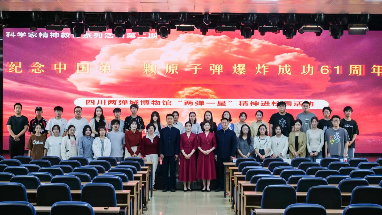 为深入学习贯彻习近平总书记关于科技创新的重要论述,推动科学家精神进校园,学校马克思主义学院联合四川两弹城博物馆在绵阳校区举办科学家精神教育系列活动。活动主要分为“纪念中国第一颗原子弹爆炸成功61周年”主题教育讲座和为期20天的“两弹一星”精神教育进校园陈列展两大部分。10月16日下午,马克思主义学院绵阳校区教师和460余名学生参加活动。