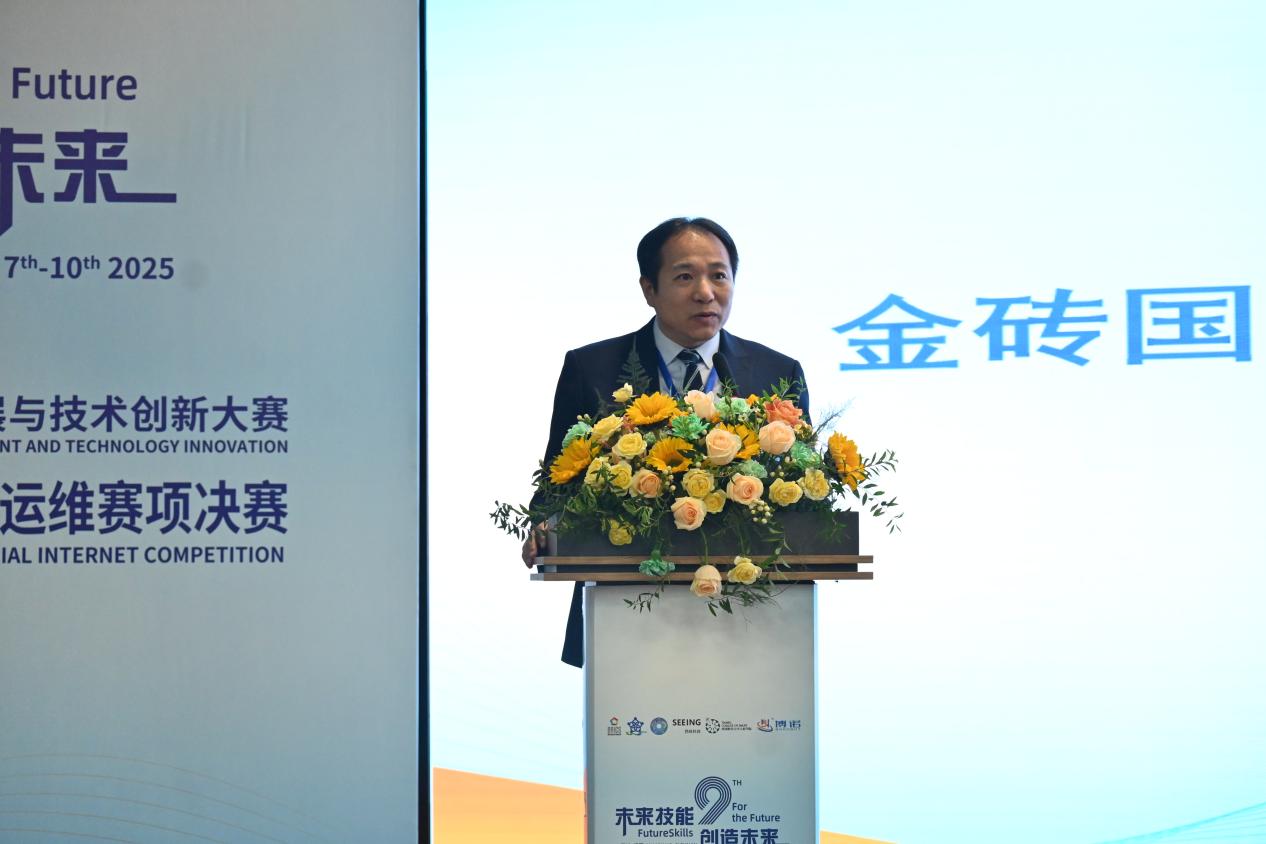 欧洲自然科学院院士邓三鹏作为特邀嘉宾致辞。他肯定了金砖大赛在推动国际技能交流与技术创新方面的重要作用,指出工业互联网是全球产业升级的核心方向,智能部署与数字运维技能是新时代技术人才的必备素养。他希望参赛选手能把握此次交流机会,深耕技术领域,锤炼专业本领,同时期待各国通过赛事深化合作,共同攻克技术难题,推动工业互联网技术创新与应用普及。