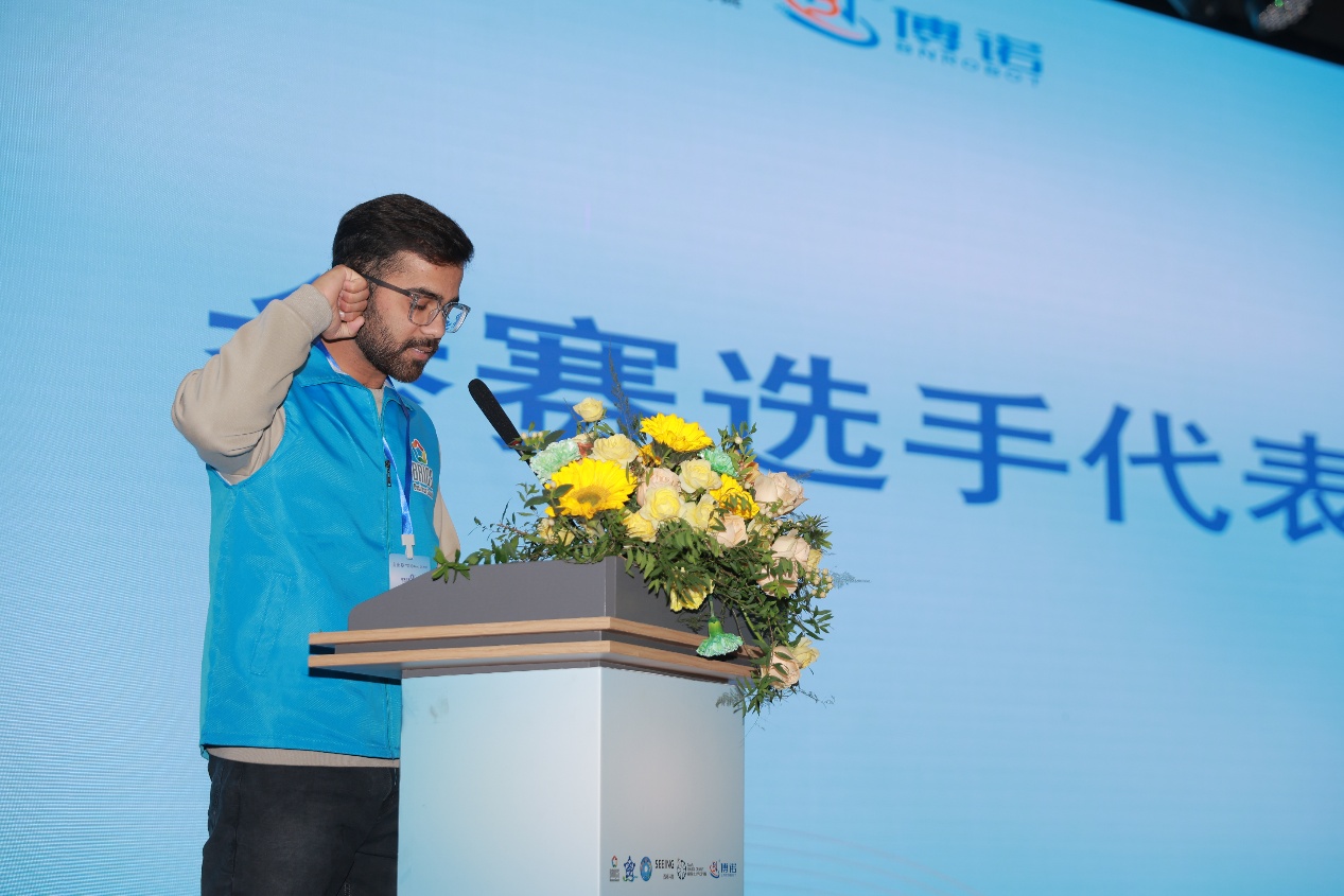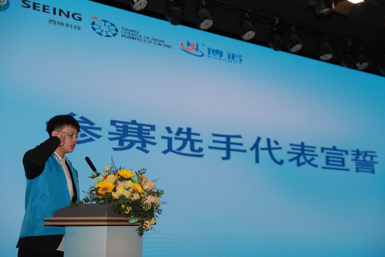 云南工商学院副教授何博代表全体裁判员宣誓。他承诺将严格遵守竞赛规则与裁判纪律,秉持公平、公正、公开原则,认真履行裁判职责,确保竞赛结果客观准确。中方参赛选手代表、西南财经天府学院学生李朝俊,外方参赛选手代表、河北工业职业技术大学学生阿巴斯先后登台宣誓。他们表态将严格遵守竞赛章程与赛场纪律,尊重对手、服从裁判,以良好的精神风貌全力以赴投入比赛,展现新时代技能人才的专业素养与担当。