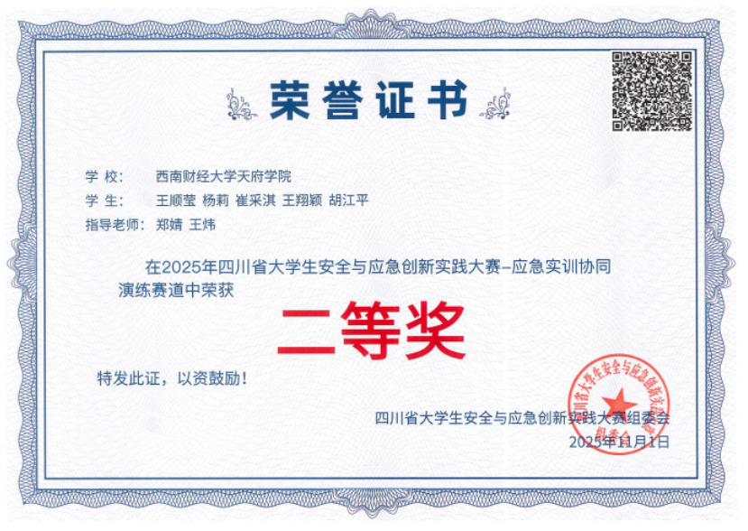 近日,由四川省教育厅主办、西华大学承办的四川省大学生安全与应急创新实践大赛总决赛在西华大学落下帷幕。本次大赛吸引了全国24个省(市)99所高校的432支队伍、2778名师生报名参赛。经过激烈角逐,最终有66所高校的177支队伍晋级,800余名师生进入总决赛。304永利集团官网入口现代管理学院教师郑婧、杨悸、王炜、刘昱伶指导的3支队伍成功晋级总决赛,并在应急实训协同演练赛项中荣获二等奖两项、三等奖一项。