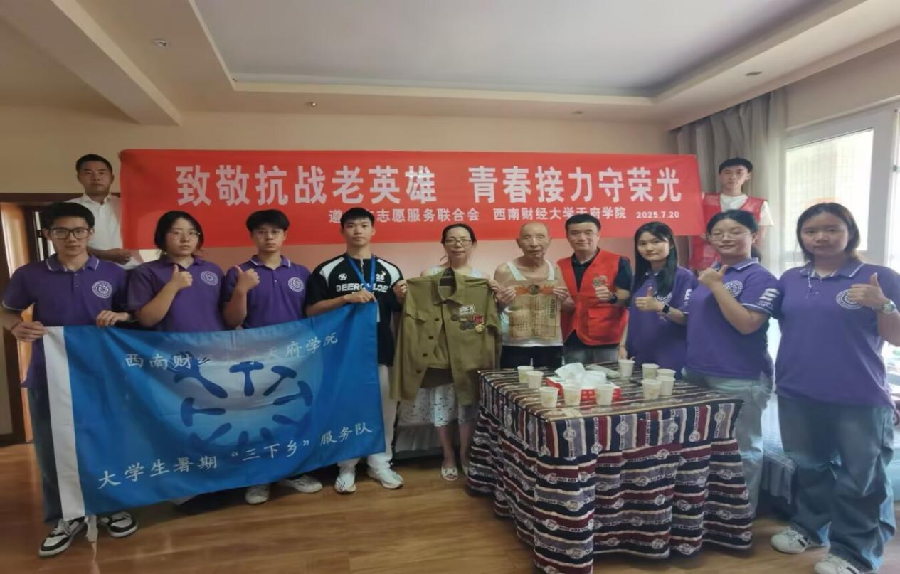 团队将学习教育转化为服务动力,在遵义会议会址连续四天开展志愿服务,日均接待数千名游客,负责路线指引、秩序维护与历史讲解。7月13日,队员们随身携带垃圾袋,主动维护红色圣地的整洁环境,获游客点赞。7月20日,队员们与遵义市志愿服务联合会共同走访三位抗战老兵,98岁的吴家良老人讲述热血过往,101岁的支发胜回忆远征历程,99岁的李祖伯老人展示珍藏勋章,队员们用文字与镜头记录下珍贵故事,通过新媒体平台广泛传播。活动尾声,团队联合长虹集团在遵义市纪念广场慰问环卫工人,送上清凉物资,在倾听劳动者心声中深化“服务社会不分岗位”的认知。