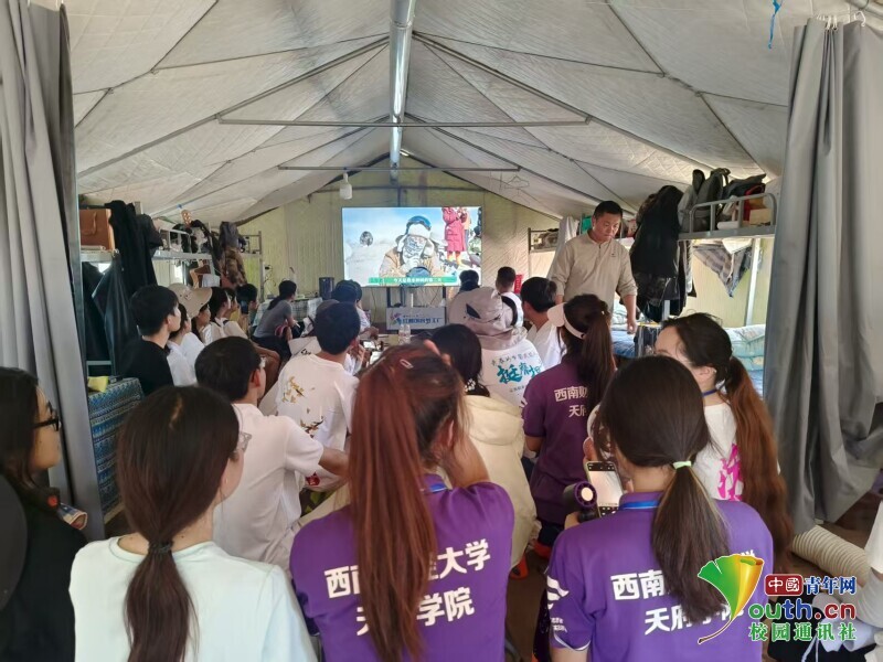 图为团队成员正在观看防沙治沙纪录片。罗晓月 供图