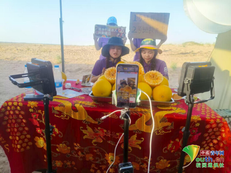 图为团队成员在瓜棚进行公益助农直播。 罗晓月 供图