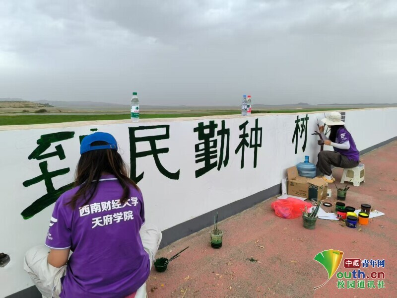 图为团队成员在红崖山水库创作“请到民勤种棵树”主题墙绘。 刘科含 供图