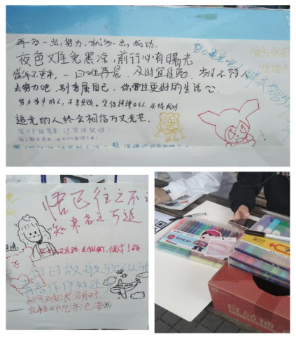 此次活动在线下开展,活动前期,相关工作人员在商业街进行摆点。活动过程中,同学们踊跃报名,然后通过书写便利贴和涂鸦的形式参与本次活动。便利贴上写满对学习生活、就业工作和对未来的期望等,如:“天天开心”“一切都是最好的安排”“加油你是最棒的”……还有在白布上用自己独特的文字和绘画进行创作涂鸦,内容包括自己的优缺点、座右铭、以及想对自己说的话等。同学们通过涂鸦和书写便利贴的方式抒发自己的心情、释放压力、调节情绪、享受身心的放松与愉悦。一张一张的便利贴,一笔一划的真挚情感,热烈且清晰,搭建起爱的桥梁,承载着同学们的祝福与爱意。