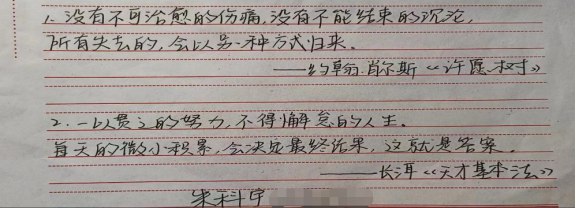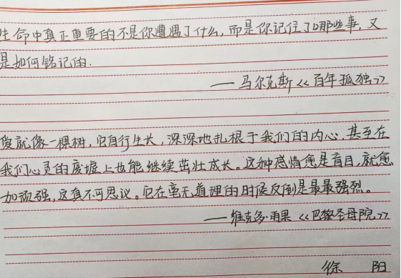 本次活动开展形式新颖有趣,吸引了较多同学参与。报名成功的同学分别充当出题人、答题人和分享者的角色来参与活动,即:出题人首先要想出两道与书籍相关的题目让答题人来回答出书名及作者,再由答题人在题目中选择一道题回答,回答出书名及作者,最后分享人在稿笺纸上写下其分享书籍中的佳句或优美段落,并写出对应的书籍及作者,工作人员审核通过就算参与成功。分享者带来的佳句让人感触颇深,如,牟婉婷同学分享了《马丁·伊登》中的“一个人只要有意志力,就能超越他的环境”,告诉我们意志力是我们生命中不可或缺的可贵品质”;朱科宇同学分享了《许愿树》中的“没有不可治愈的伤痛,没有不能结束的沉沦”,让我们明白人生要朝未来看去,前路漫漫亦灿灿。