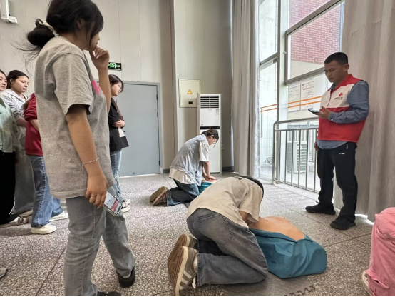 同学们认真练习心肺复苏手法要领