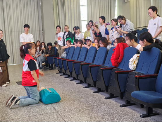 此次培训分为线上答题测试、理论知识讲授、急救操作方法、线下实践考试四个部分。在理论讲授部分,冼义林首先告诉同学们红十字运动起源于战地救护,中国红十字会成立于1904年,并以“人道、公正、中立、独立、志愿服务、统一和普遍”为基本原则。接下来,冼义林为同学们详细介绍了各类突发事件的应急处理流程及急救技术要点,深入剖析了急救知识在紧急救援中的关键作用,使在场同学对急救的重要性有了更为深刻的认识,并以心肺复苏为例,为同学们科普了急救要领。