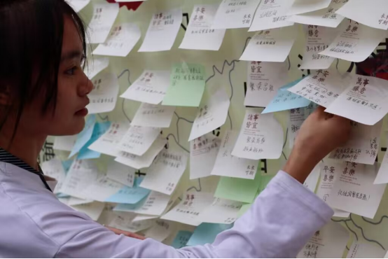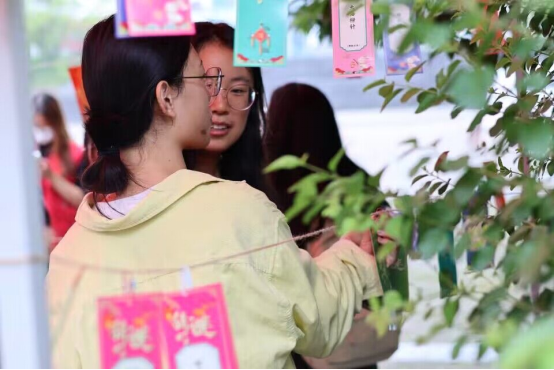 活动前期,工作人员在学校时代广场进行摆点宣传。五彩斑斓的灯谜卡片,精致小巧的灯笼,活动现场的精美装饰吸引了无数师生的目光。在这次活动中,设有猜灯谜、写便签“祝福祖国”以及拍照打卡集赞活动。