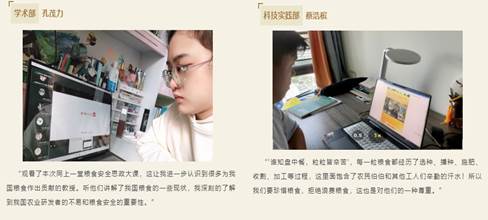 课程中,中共黑龙江省委党校姜国忠教授分析了我国耕地面临的挑战,强调土水资源匹配的重要性,要求坚守耕地保护红线、提高耕地质量,通过保质量把“藏粮于地”落到实处,积极推广已被实践证明的有力种植模式。武汉大学章志宏教授根据当前疫情形势,就如何应对我国粮食安全提出具体要求。四川农业大学的杨文钰教授讲述了中国的粮食安全成就及中国特色粮食安全之路。三位老师回顾了中国共产党奋进的艰苦岁月,以情化人,教育引导青年学生厚植爱国主义情怀。