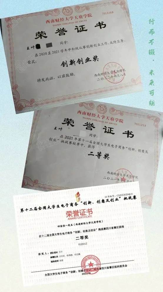 在学习上,她态度认真,成绩优异,在校期间获得国家奖学金、两次甲等奖学金,获得第十二届全国大学生电子商务“创新,创意及创业”挑战赛获二等奖,2022第二届英国生态设计奖获银奖、两次优秀学生干部,中英国际创意大赛获铜奖......她是老师心中的优秀学生,是同学们眼中秀外慧中的学霸。