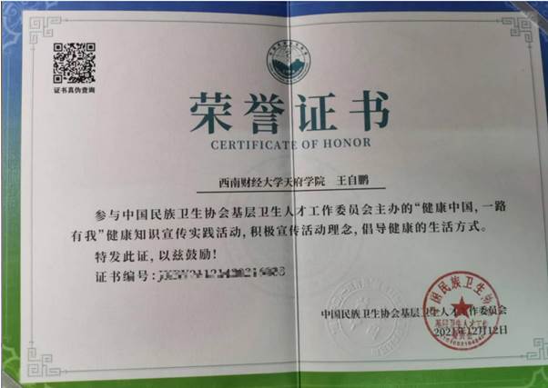 “健康中国,一路有我”健康知识宣传实践活动荣誉证书