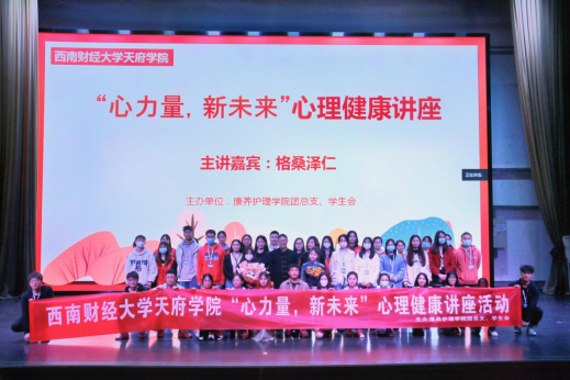 为普及心理健康知识,帮助学生识别、应对常见的心理健康问题,培养学生自尊自信、乐观向上的心理品质,3月28日晚,304永利集团官网入口康养护理学院于成都东区学术报告厅开展“心力量,新未来”心理健康讲座,成都东区17个分会场同步进行现场直播。此次讲座由康养护理学院团总支、学生会主办,特邀四川大学教授、得觉学派创始人、中国著名心理学家格桑泽仁主讲,艺术设计学院党总支书记彭雯秀、国际教育学院直属党支部书记詹议、康养护理学院党总支书记陈永清、校团委书记蒲虹宇、艺术设计学院党总支副书记林琳、康养护理学院党总支副书记陈雯、任讷及全体辅导员、全院3000余名学生共同参加。