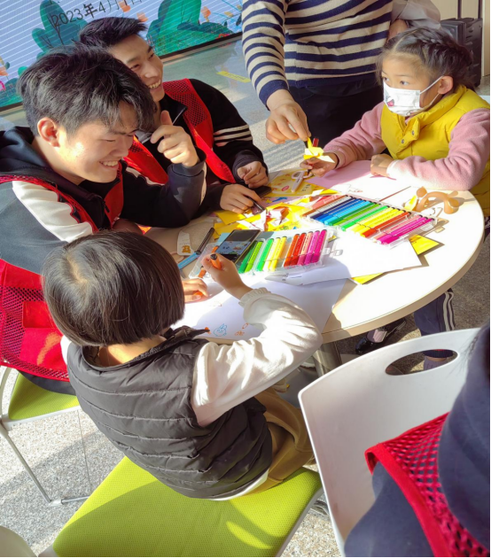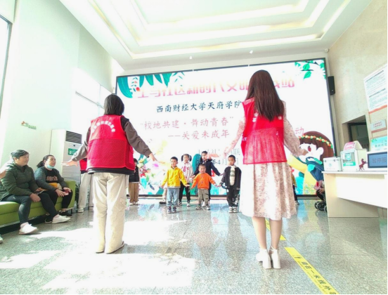 在志愿服务活动中,志愿者们一对一地带领小朋友们画画剪纸,耐心地教小朋友们写字,与小朋友们进行交流。做完手工后,志愿者们拿出扩音箱,放着充满活力和柔和有趣的音乐,小朋友们被这音乐吸引过来,并排排队站好,随着两位志愿者一起跳着欢快的舞蹈。春风拂面,一缕缕阳光洒在志愿者和小朋友的脸上,天府学子们用爱与行动诠释了“奉献、友爱、互助、进步”的志愿服务精神。