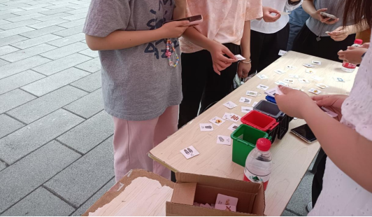本次活动在线下开展,前期通过“团学君”进行线上宣传,同时各班级纪检委员将活动信息转发至班群提高参与率。活动分为两种形式,形式一为“垃圾找一找”,参与同学需要找到藏匿在校园当中的垃圾种类小卡片并提交到指定地点。形式二为“驿站传递”,同学们两人一组,通过对方口型成功猜出垃圾种类即视为参与成功。
