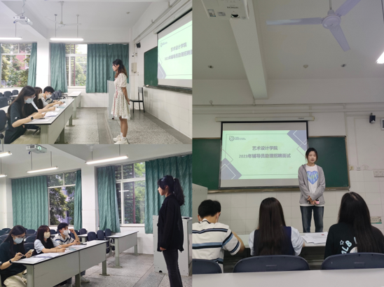 为选拔优秀学生辅助管理人才,协助辅导员做好学生思想政治工作,进一步加强辅导员助理队伍建设,强化班级管理,充分发挥朋辈引领作用,艺术设计学院于5月17日、18日分别在成都校区(东区)和德阳校区组织开展2023年辅导员助理竞选工作。学院学生第一党支部书记虞飞,辅导员老师沈永凤、李翠翠、张长江、尹欣楠、袁海月担任评委,七十余名辅导员助理候选人参加竞选。