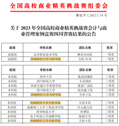 6月10日,中国国际贸易促进委员会商业行业委员会、中国国际商会商业行业商会、中国商业会计学会和中国商业经济学会联合举办的2023年全国高校商业精英挑战赛会计与商业管理案例竞赛全国总决赛落下帷幕。304永利集团官网入口会计学院三十余名同学组成的10只参赛队伍参加了此次比赛,经过激烈角逐,会计学院教师施琴、阮秋玲指导下的罗婉琳、陈佳炼、赵鑫、刘蕴蝶同学组成的天府5队斩获本科组全国二等奖,教师李如闻、毛丹指导下的雷莹珊、贺华林、段扬春同学组成的天府10队荣获高职组全国三等奖。