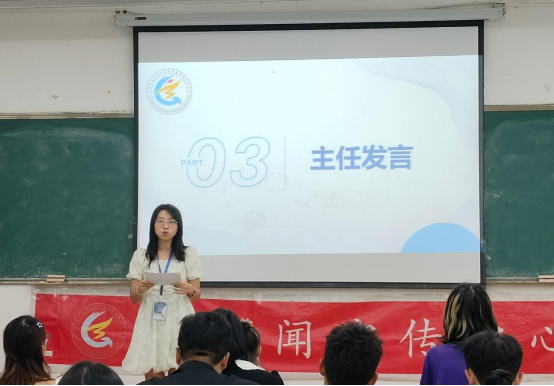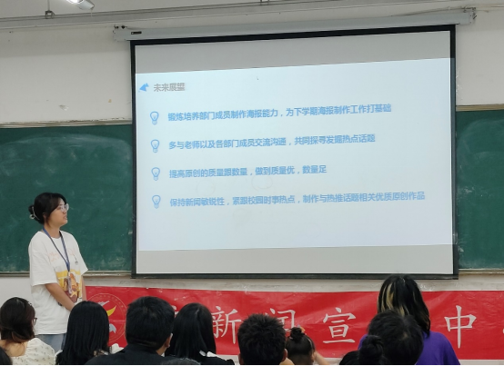 随后,付蓉钰琦对校新闻宣传中心在本学期所获得的荣誉进行了补充。她表示,校新闻宣传中心能在微博造浪音乐节最具影响高校投票中荣获四川省第一名,在中国大学生在线2022年度中入选校园媒体百强等,每一项荣誉都离不开校新闻宣传中心每一位成员的努力。她对每一位部员的付出和老师的指导表示感谢,并希望大家总结经验,保持热爱,让学校宣传工作更上一个新台阶。
