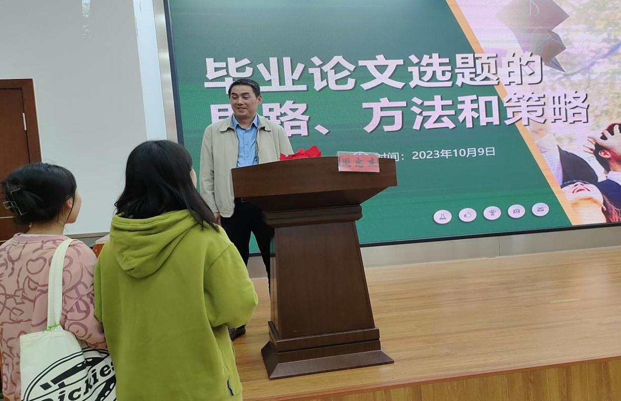 毕业论文作为课程体系的重要组成部分,选题是写论文的第一步,也是最关键的一步。为了提升同学们的论文写作能力,拓展其论文思维,文化与教育学院特邀请外语系主任周忠杰副教授于10月9日开展了“关于论文的若干思考”主题讲座活动。此次活动面向文化与教育学院全体学生,共有150人参加。