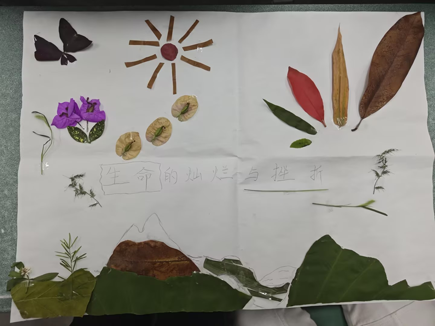 本次心理课堂以花、草、树、叶为载体制作有关生命主题的海报,同学们热情参与。张玉婷表示,每个人的生命都是独一无二的,无论经历何种悲喜,都是自己在体验。吕碧莲表示,生命的世界是多元且多样的,友情、亲情不仅是人类的专属品,枯黄的树叶并不意味着生命的衰败,而是意味着新生的开始。黄杰说到,生命是灿烂且挫折的,生命的旅程不止一马平川还有高山荆棘,当越过生命中的高山,阳光、蝴蝶、鲜花等等,那些生命中美好的东西都会围绕着你。生命的轮回就像海报中那五片颜色渐变的树叶,寓意着生命的不断变化和更新。