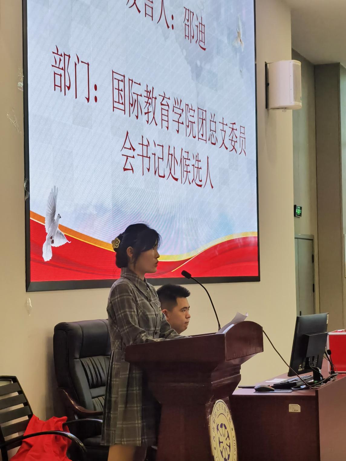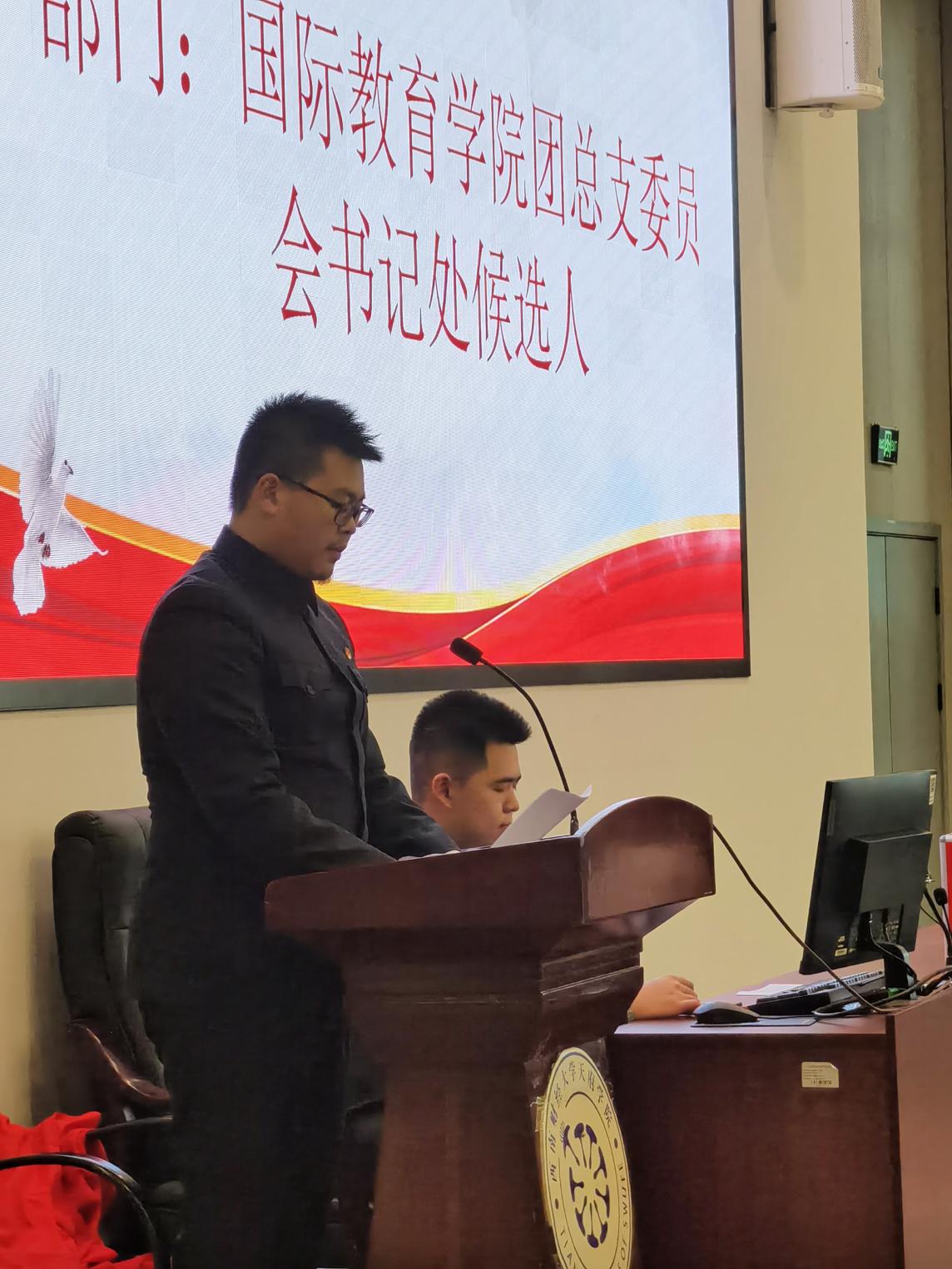 大会第三项议程为大会选举换届,本次大会选举人员为国际教育学院团总支委员会秘书处成员。在发言中三位同学们都表示团总支宗旨就是“全心全意为同学服务”,做好团队建设,在未来的工作中既要继承优良传统,也要敢于创新,齐心协力完成好学院相关工作。