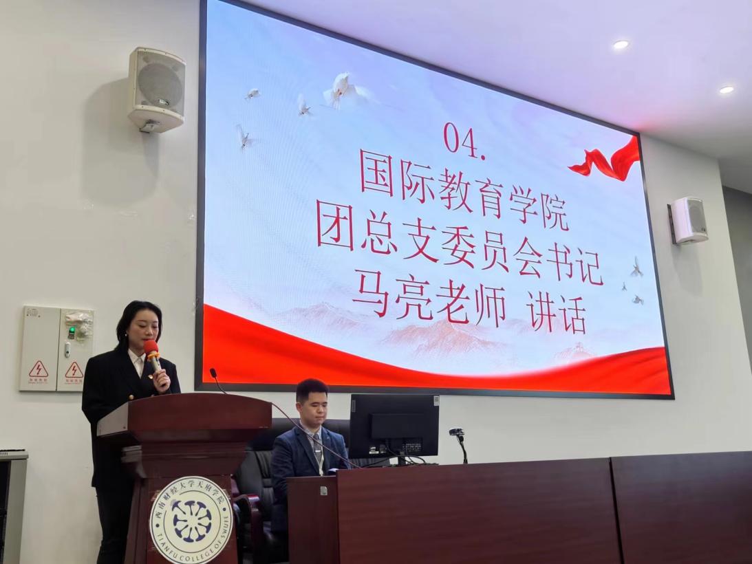 国际教育学院第二届团总支委员会书记发言。马亮同志代表上一届国际教育学院团总支委员会作报告。此次报告总结了学院上一届团总支、学生会五年来的工作情况及经验,也对下一段崭新历程的工作进行了规划。