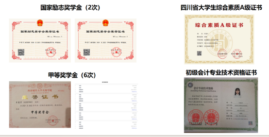 牟曼宁获得国家励志奖学金2次、校级甲等奖学金6次、总平均绩点3.79。同时,她还获得四川省综合素质A级证书、初级会计资格证书,以及四川省“优秀毕业生”、优秀大学生、优秀共青团员等荣誉称号。