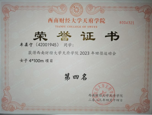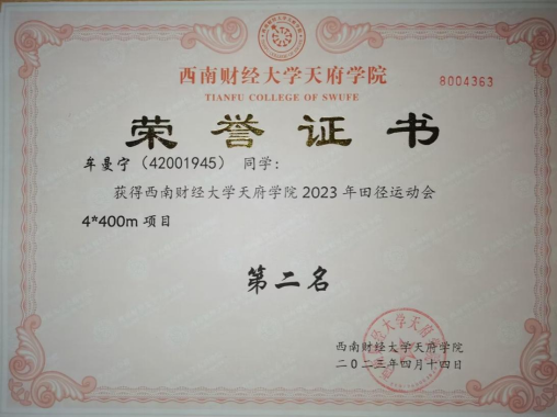 她热爱运动,坚持锻炼,注重健康生活,良好的习惯使得她在2023年田径运动会女子4×100米项目第四名以及4×400米项目第二名。通过运动,她调整状态,放松身心,让自己更加积极健康快乐的生活学习。