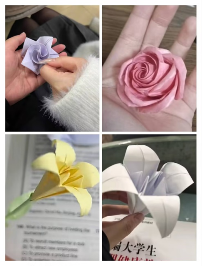 活动前期,工作人员将活动参与要求公布在活动群中,鼓励同学们积极参与,借此机会锻炼自己的动手能力,活动主要内容为用心折出一枝美丽的花朵,用以致敬我们身边最美的劳动者。活动过程中,同学们用相机记录下赠花之举,有的人将娇嫩的玫瑰花赠予宿管阿姨,表达对她们辛勤付出的感激之情;有的人将生动的山茶花赠予环卫阿姨,感谢她们为校园环境整洁付出的努力;有的人将栩栩如生的康乃馨赠予教师,表达对他们的崇敬与感激。一张张照片,记录下同学们与劳动者之间的互动和情感交流,展现出他们对劳动者的敬意和感激之情。这些照片不仅是对劳动者辛勤付出的肯定,更是对劳动精神的传承和弘扬。