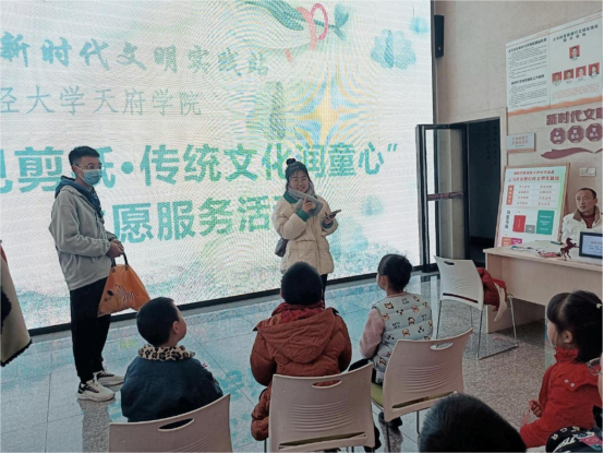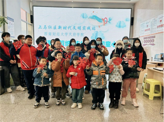 活动伊始,志愿者们用亲切的口吻,绘声绘色的为孩子们讲解了剪纸的文化背景及发展史,让孩子们对剪纸有了初步认识。在剪纸活动的体验和实践环节,志愿者们耐心的教孩子们剪纸,孩子们借助工具,尝试着不同的风格和技巧,剪刻结合,沉浸在别具魅力的剪纸创作之中。大家亲身体验才知道,剪纸看似简单,但还需要长期练习才能得心应手。实践操作结束后,小朋友们开心地举起了自己的工艺作品与志愿者合影留念。