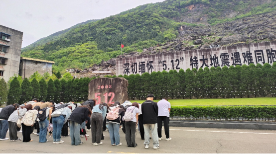 北川老县城是2008年汶川特大地震受灾最为严重的地区之一,现作为地震遗址完整保留下来。在北川老县城地震遗址,学生通过实地参观和教师的讲解,深切体会到地震给当地民众带来的深重苦难。在北川地震纪念碑前,师生共同为死难者默哀、鞠躬。