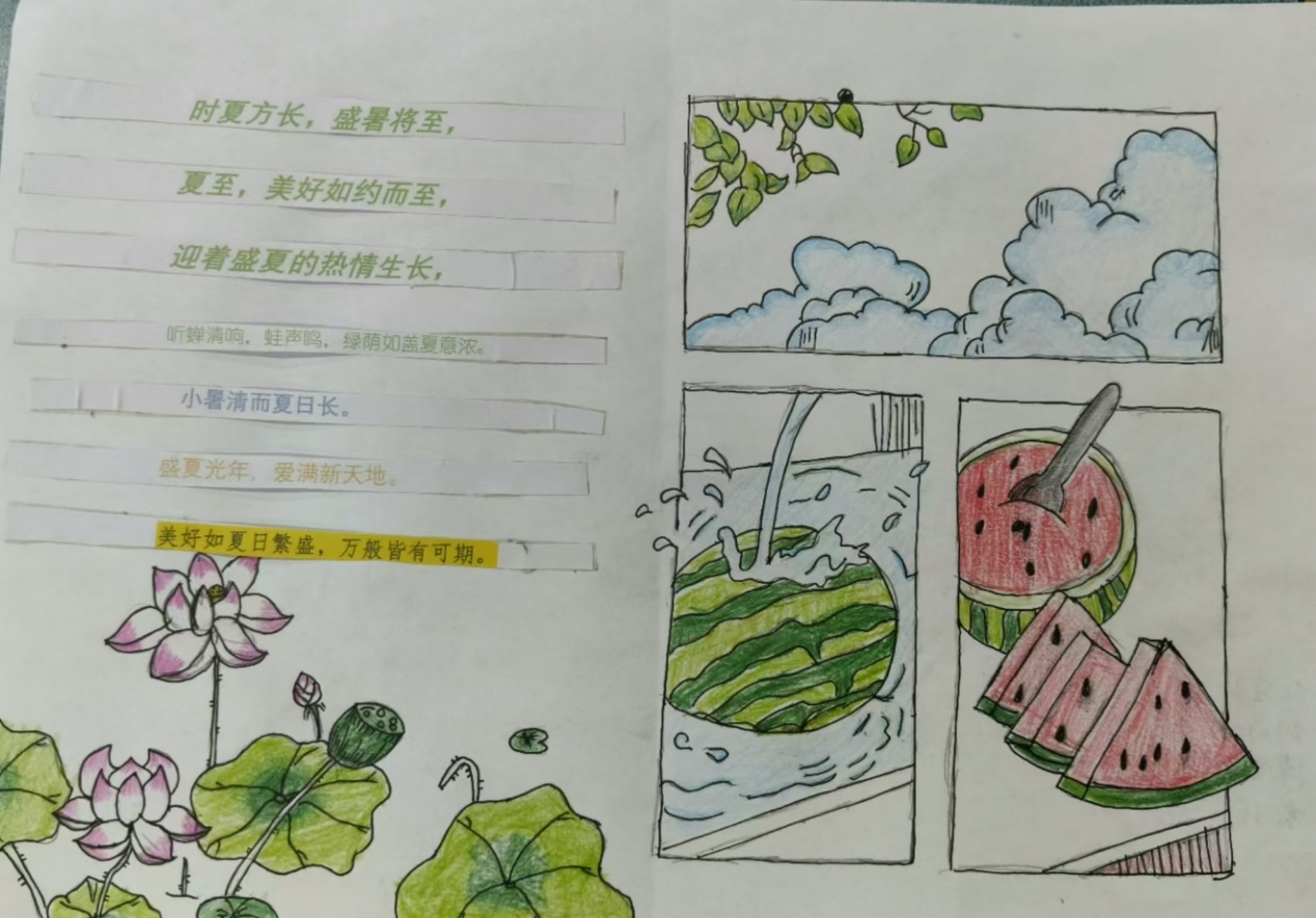 各小组学生从纸盒中抽取出五彩斑斓的纸片,共同商讨拼接方式、构思成品图案,逐一挑选、拼接各色纸片,以夏日风物做衬托,尽显盎然本意:蓝天与绿叶,西瓜与白猫,夏日与雪糕……色彩斑斓,诗情画意,相得益彰。
