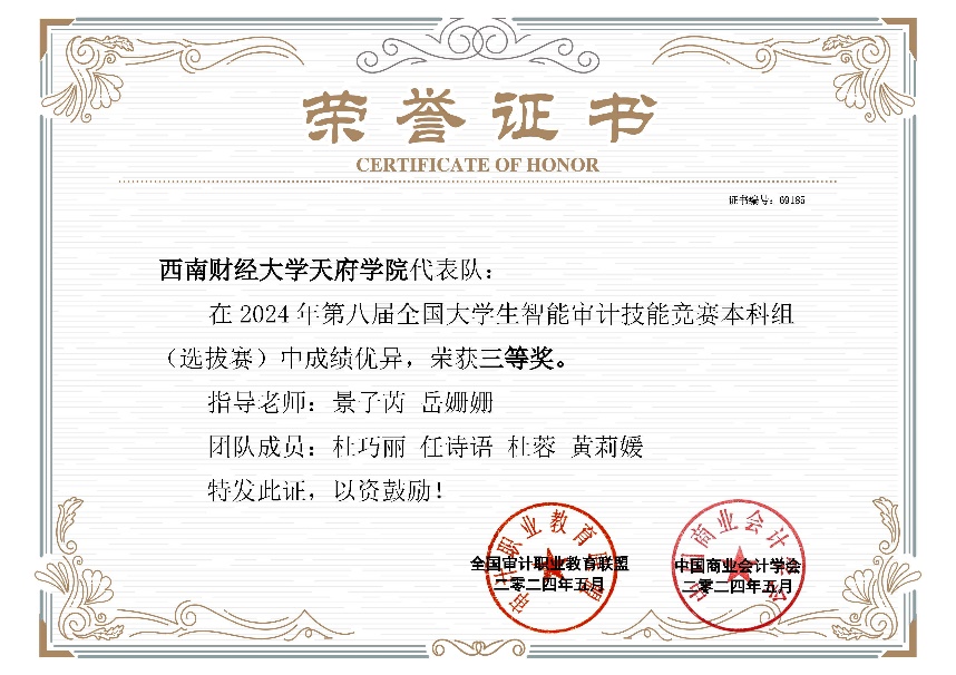 近日,由中国商业会计学会联合全国审计职业教育联盟举办的2024年第八届全国大学生智能审计技能竞赛全国选拔赛落下帷幕。会计学院教师郭桐遥和李丹指导的学生梅彩情、 胡欣、石元一、惠思钰以及景子芮和岳姗姗指导的学生杜巧丽、任诗语、杜蓉、黄莉媛均获得了本科组选拔赛三等奖。