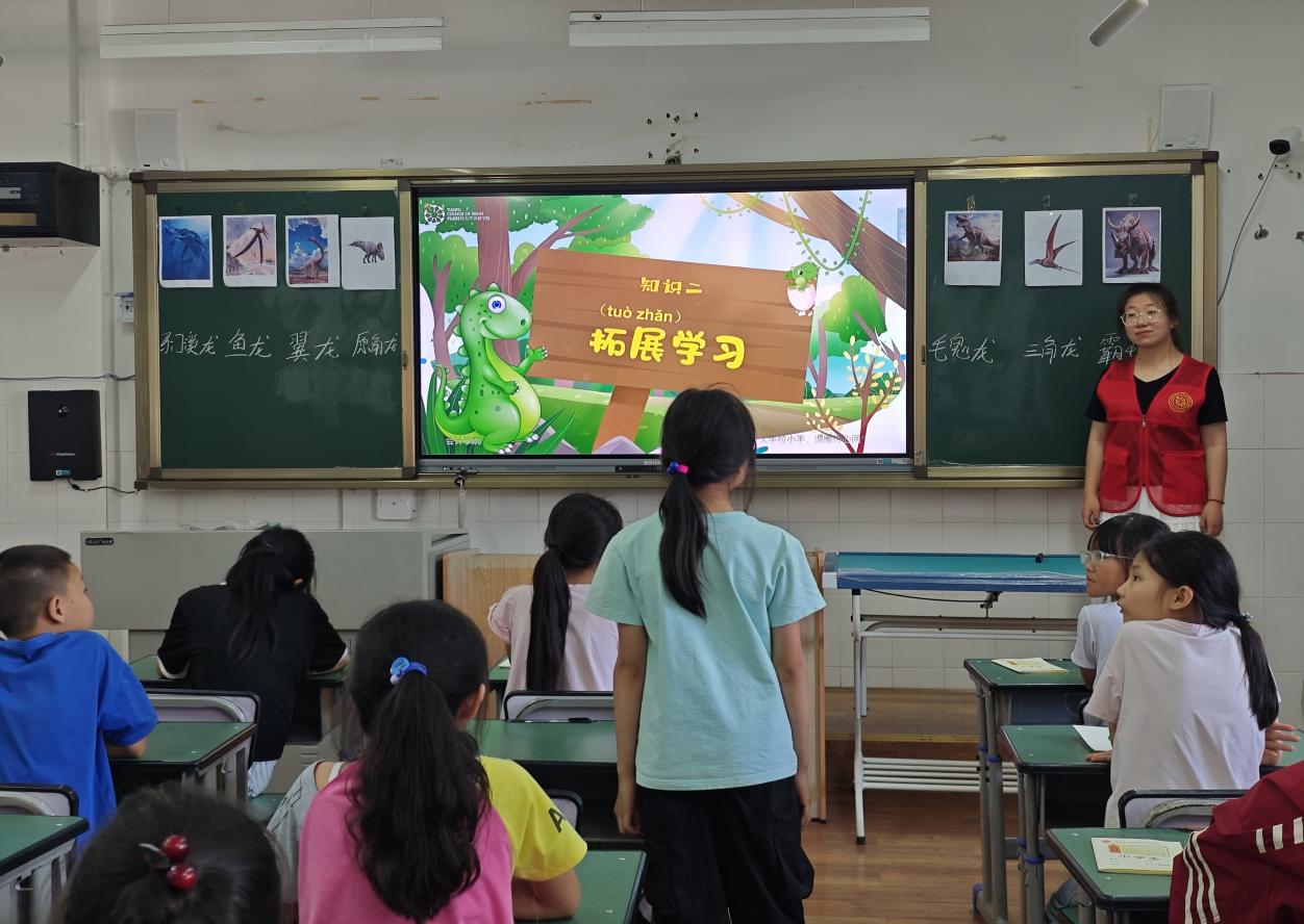 活动伊始,志愿者王祯悦、王梦瑶、王鑫煜通过展示有关恐龙的视频引发对恐龙知识的话题讨论。志愿者们通过提问激发孩子们对恐龙的热情和好奇心,并让孩子们互相交流,举手发言。在志愿者们的引导下,孩子们自主合作,探究分享,这种学习方式真正地把课堂还给学生,调动起了孩子们的积极性,同时也加强了孩子们对恐龙的了解程度。在学习过程中,孩子们积极交流、相互讨论,现场气氛热烈而和谐。活动的最后,孩子们纷纷分享学习心得和课堂收获,志愿者们也给孩子们发放小礼品,鼓励他们继续探索恐龙的奥秘。这次活动让孩子们了解到有关恐龙的知识,拓宽了孩子们的视野,提升了知识储备。结束后,支教团队与孩子们合影留念。