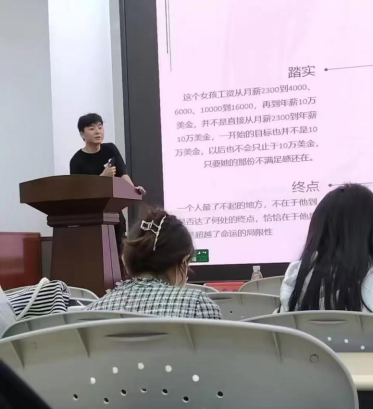 张煜曾与志同道合的朋友创办公司、为就业自学三维课程、努力实习增加工作经验,具有丰富的创业、就业经验。讲座伊始,张煜以自己的就业经历中遇到的困难和挫折作为案例,提醒大家在就业过程中选对行业、付诸行动、不断学习并建立危机意识。之后,张煜对自己的就业过程进行了介绍,详尽地向学弟学妹们分享自己的就业经验,包括自己的面试经历和对自身发展的规划,并表示,“学业规划和职业规划是就业过程中的重要环节,努力也必不可少,在任何一个行业,努力的人都将在未来发光”。讲座最后,张煜就自己创业、就业方面遇到的问题和困难时的解决过程与同学们展开交流,为面临就业的学弟学妹们增添就业信心。