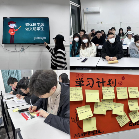 学院各个班级采取《学生手册》再学习、《学生手册》知识竞答、创作文明标语、学生代表分享学习经验、建立学习帮扶小组、班级学习宣誓、制作学习目标小卡片等方式,让班级的每位同学树立了明确的目标,端正了自身的学习态度,营造了一个积极向上的学习氛围。2022级本科环境设计03班的学习委员裴若云还为同学们制作了“你的困难”垃圾箱,同学们写下了自己在学习上所遇到的困难,投进“困难垃圾箱”,努力克服自己不敢面对的困难,同学们也表达了自己的一些期望,想要在这学期提高自己,做好班级建设,为班级的荣誉贡献一份力量。2020级本科产品设计B01班学习委员梁宇带领班级同学一起制作了学习目标小卡片,他说到:“在学风建设月,班级同学上课出勤、学习积极性、班级纪律等各个方面都有了一定的提高。”