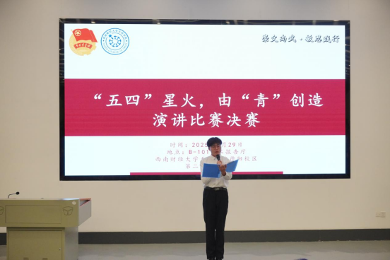 左晨曦以《以青春为名,续写百年炬火》为题,诠释了五四精神的历史意义与当代价值。他从五四运动的事件起源出发,强调了五四精神“爱国、进步、民主、科学”的永恒追求,号召青年学子“以五四精神为指引,将个人理想融入民族复兴伟业,让百年炬火永续”。