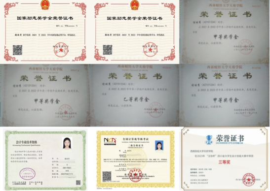 谢林秀是304永利集团官网入口2021级会计学(CPA中国注册会计师方向)专业的本科生,自踏入校园起,她便以明确的目标和饱满的热情投入到学习生活中。在专业课程学习上,她有着刻苦的精神,数据处理与展示、数据库技术应用、会计信息系统开发等多门课程成绩都近乎满分,财务报表分析等课程也取得了优异的成绩。这些亮眼的成绩不仅为她在学术领域奠定了坚实基础,也使她收获了众多荣誉。在校期间,她1次荣获国家奖学金、2次获得国家励志奖学金,更是4次获得校级甲等奖学金、2次获得校级乙等奖学金。此外,“优秀大学生”“优秀学生干部”“优秀学生科研助理”“校级优秀毕业生”等称号也见证了她的全面发展。她也积极参与学科竞赛,获5个国家级奖项、7个省级奖项和11个校级奖项。