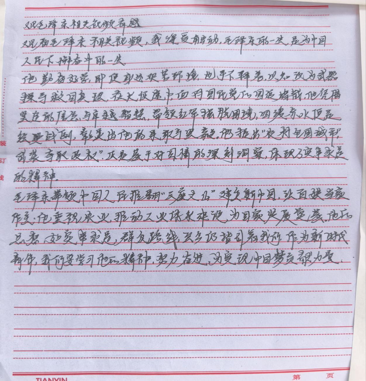 睹影识丰碑,落笔抒壮志。同学们通过线上平台观看毛泽东同志的相关视频,跨越时空,直观感受到伟人波澜壮阔的革命生涯、卓越非凡的历史贡献。观看结束后,同学们心潮澎湃,将所思所感倾注于笔端,撰写观后感。活动以创新形式推动理论学习从“被动接收”转为“主动思考”,将历史记忆熔铸为情感与思想认同,点燃学子爱国热忱与历史担当。