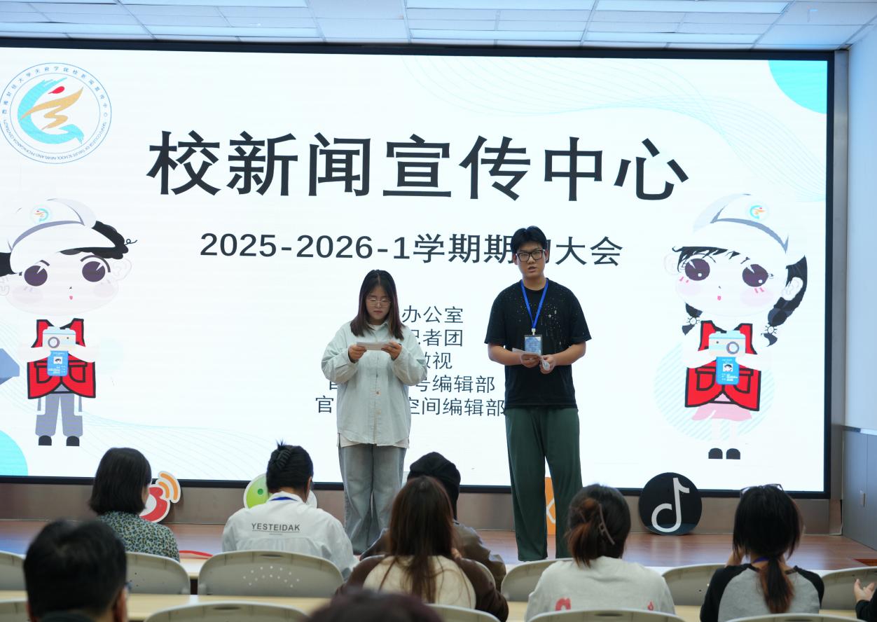 10月10日晚,校新闻宣传中心在学校绵阳校区实验楼110教室召开2025-2026-1学期期初大会,党委宣传部部长兼党委工作部常务副部长罗文出席会议,中心主任张祎睿、副主任徐雅楠及各部门成员共同参会。大会由综合办公室王亦凡和赵林菊主持。