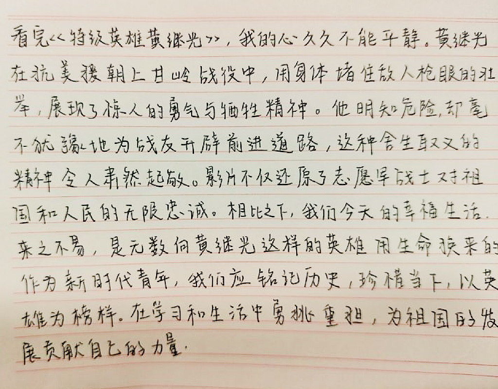 观影现场氛围庄重而肃穆,银幕镜头紧紧牵动人心。在观看到敌人猛烈火力,黄继光毅然放弃自我、用身体堵住枪眼的场景时,全场沉浸在对英雄的崇敬与缅怀中。随着剧情推进,从黄继光参军入伍的坚定信念,到战场上的英勇无畏,英雄的形象逐渐转变的鲜活立体。天府学子在光影中深刻认识到如今和平生活的来之不易。