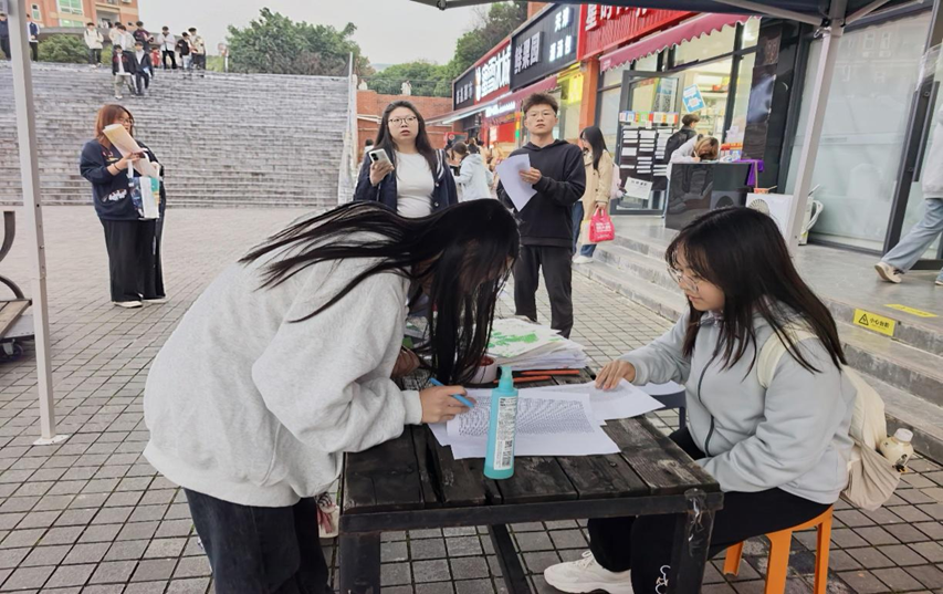 在工作人员的引导下,活动参与者通过填写收集表选择心仪植物,随后将选定的植物叶片精心排列在棉布或厚质纸巾上,通过反复敲击,使植物的自然形态与色彩完美转印于布料上。完成创作后,同学们将作品交至商业街摆点处并完成签到,整个流程有序而充满趣味。本次活动不仅延续了植物拓印这一传统非遗技艺的生命力,更让同学们在敲打拓印的过程中,切身感受到植物脉络的细腻与自然色彩的变幻。每一幅作品都凝聚着创作者对自然的观察与再创造。并且本次活动的一个亮点是,同学们不仅可以在现场欣赏、交流作品,还可以将创作成果直接带走,让这份独一无二的“秋日纪念”陪伴日常学习生活。 参与活动的同学们对此次活动给与了高度评价。